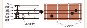 ギターには「TAB譜」という、ギターの指板をそのまま図にしたものがあり、素人でも解読可能!